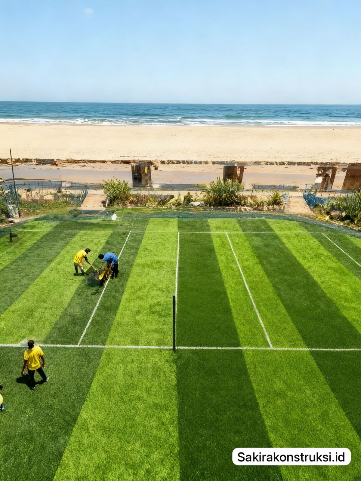 Kami memasang rumput sintetis dengan teknik khusus agar rapi dan tahan lama.